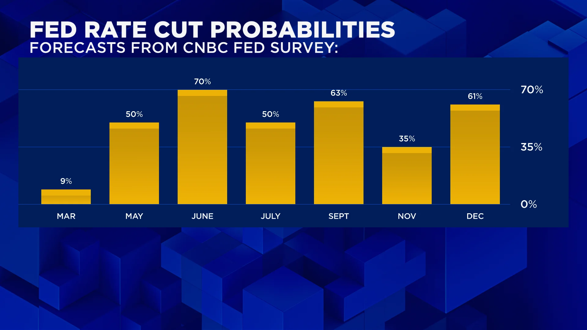 具体而言,只有9%的人认为美联储会在3月份降息,50%的人认为5月份会降息,预计6月份降息的人最多,比例高达70%。受访者平均预计今年降息次数仅为3次,而期货市场预计今年将有5次降息。